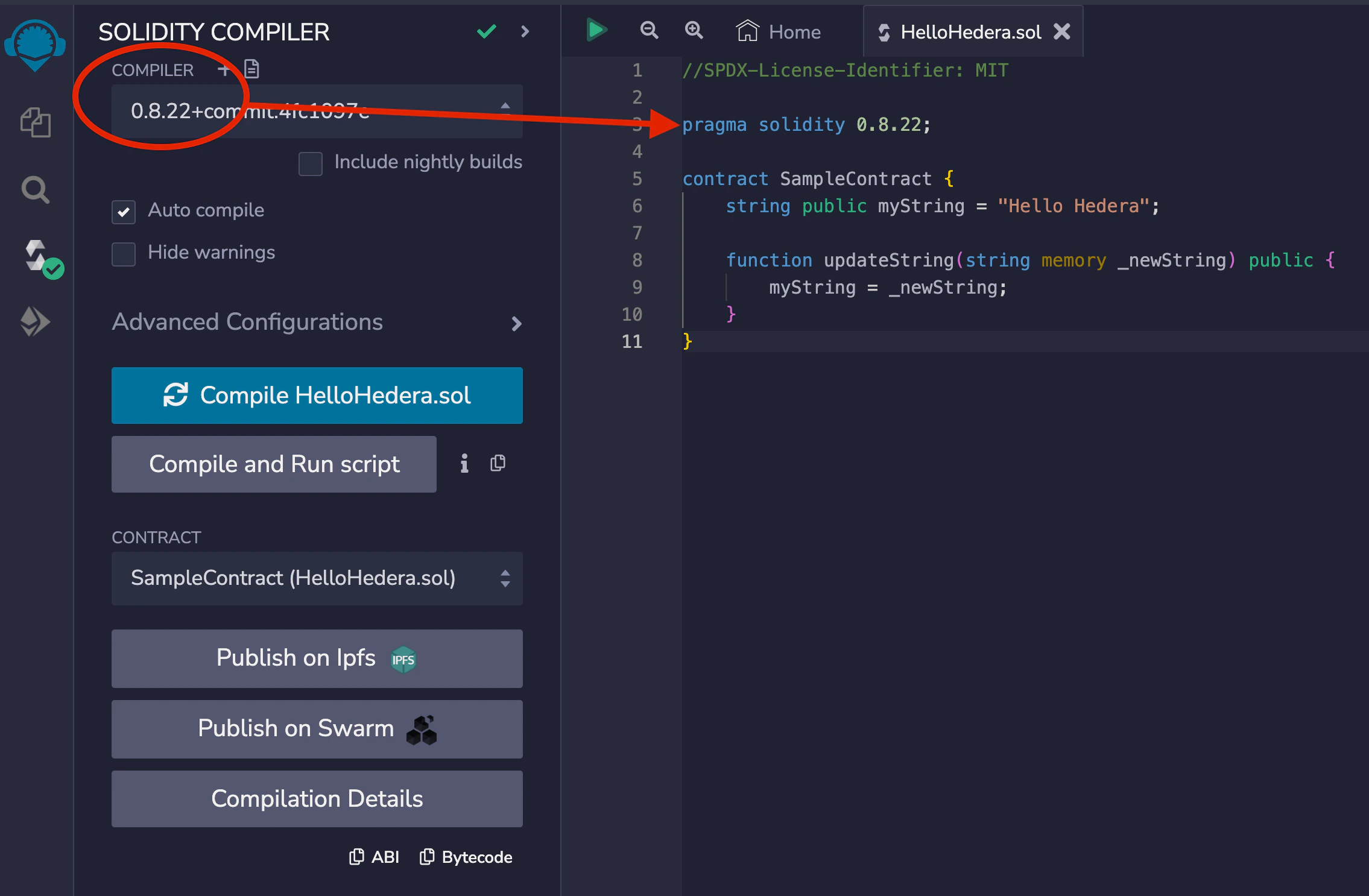Navigate to the Solidity Compiler tab in the left sidebar and check that your compiler version is within the versions specified in the pragma solidity statement. Then, compile your HelloHedera.sol contract.