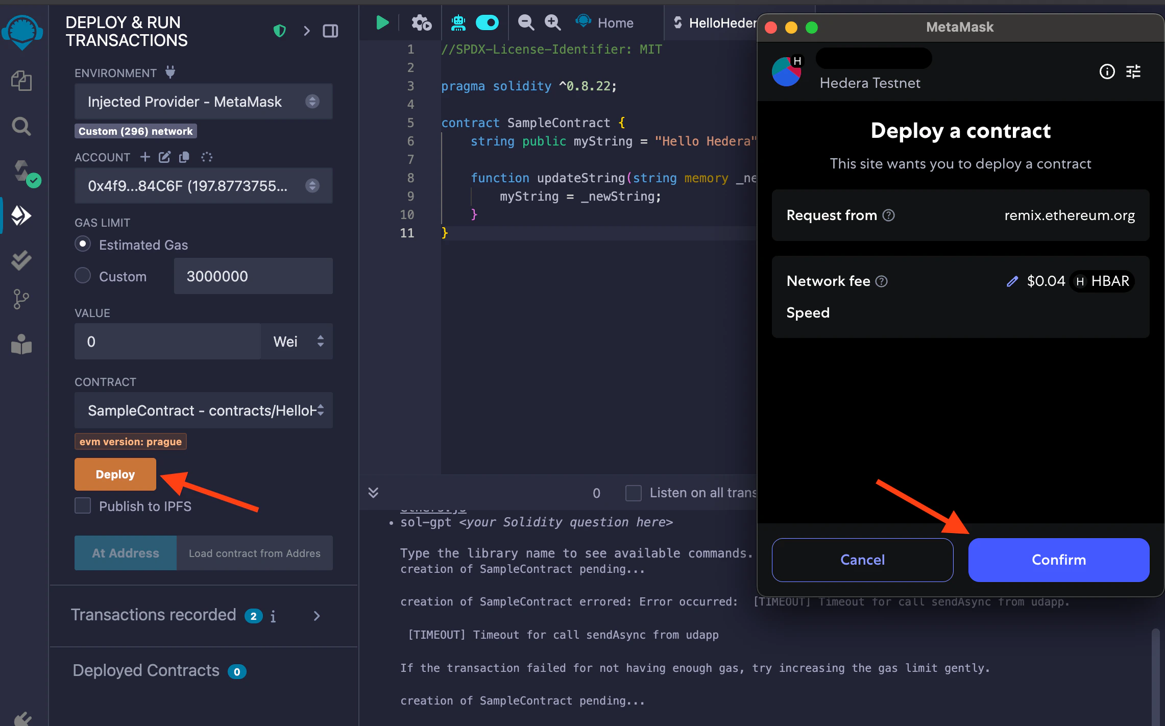 Once you click Deploy in the Deploy & Run Transactions tab, hit Confirm in the MetaMask notification window to approve and pay for the contract deployment transaction.