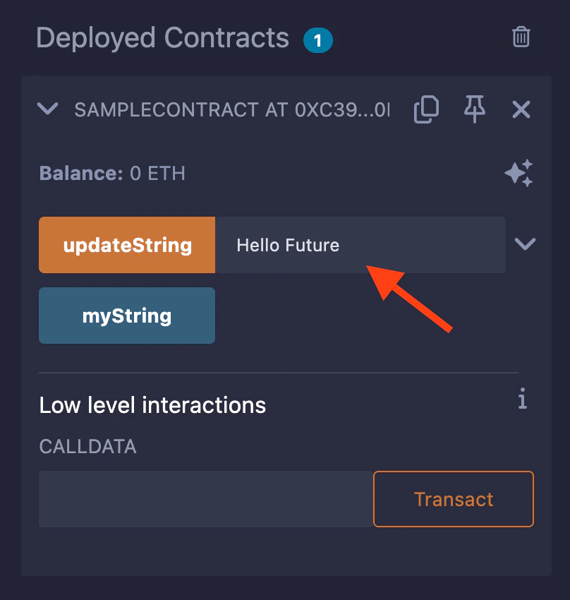 Once the transaction is successful, you can interact with the smart contract through Remix. Select the dropdown on the newly deployed contract at the bottom of the left panel to view the contract’s functions under Deployed Contracts. Write a new message to the updateString function using the input and confirm the write transaction in the MetaMask window to pay.