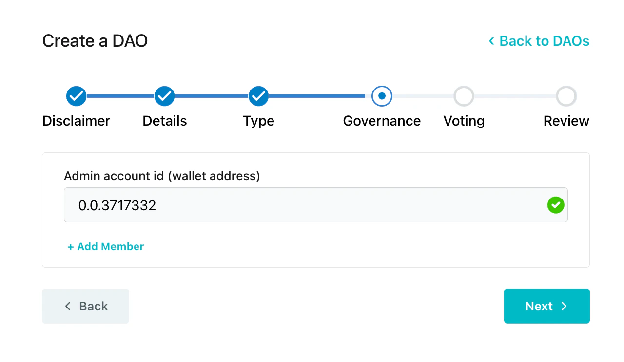 Choose the governance model that works best with your organizations’s goals. There are three models to choose from: governance token, multisig, and NFT.