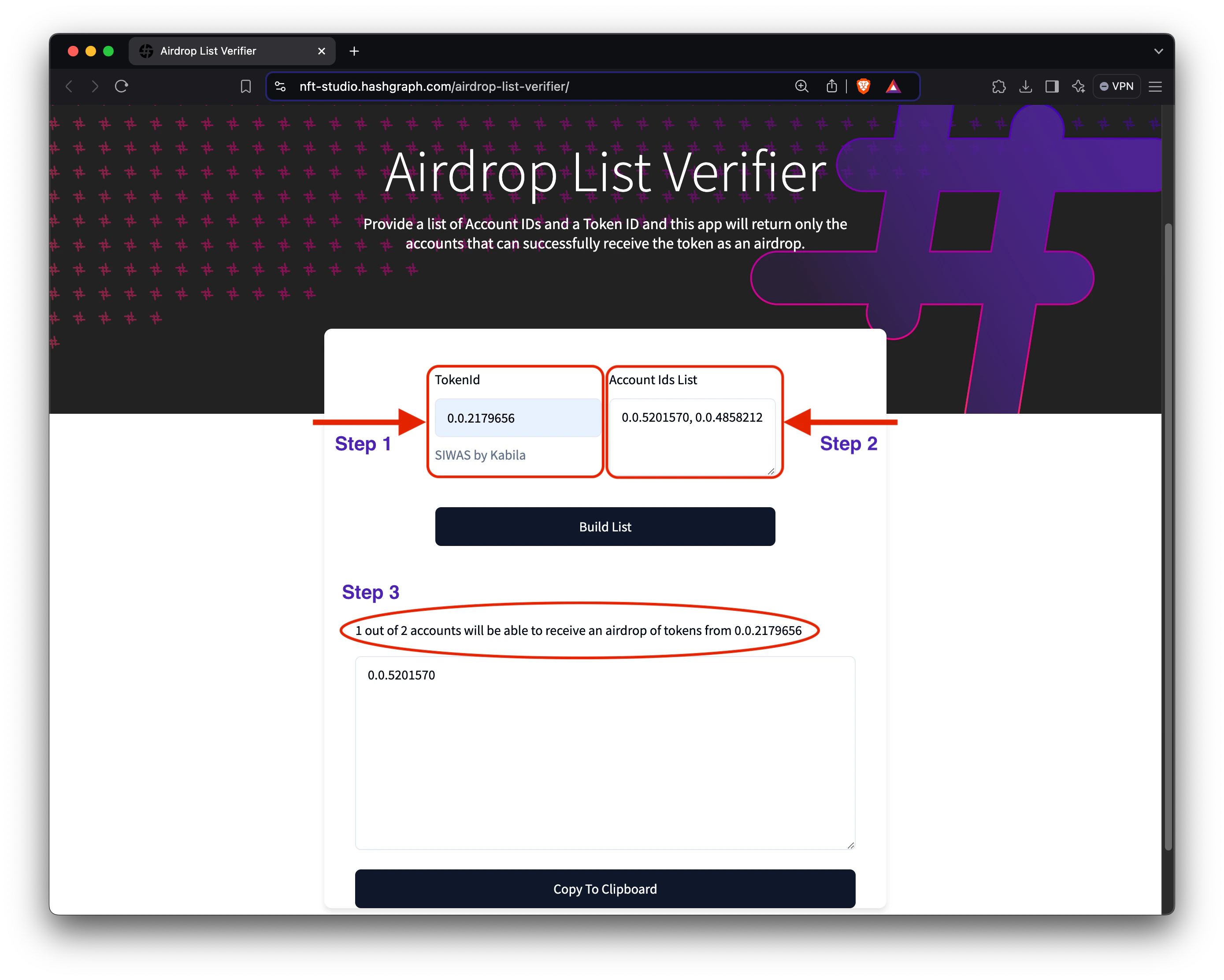 Once all details are entered, click “Build List.” The verifier will process each account ID against the specified token ID to determine eligibility. Once complete, a list of eligible accounts will be generated, enabling seamless token distribution.