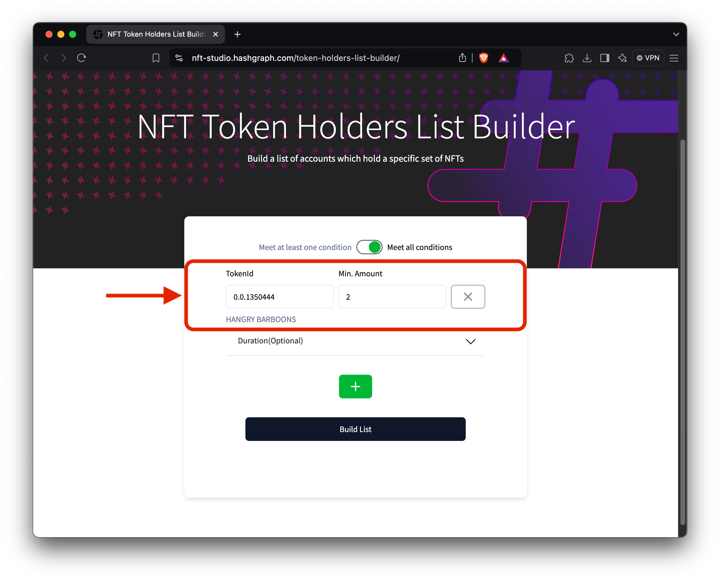 To create a more refined list, you can add additional filters for other NFT projects. For this example, let’s add a filter that requires holders to own at least two NFTs from the Dead Pixels Ghost Club collection. By default, the tool is set to meet all conditions, meaning accounts must match all specified criteria to be included in the final list. In this case, an account must own two HANGRY BABOONS NFTs and two Dead Pixels Ghost Club NFTs to be added to the list.