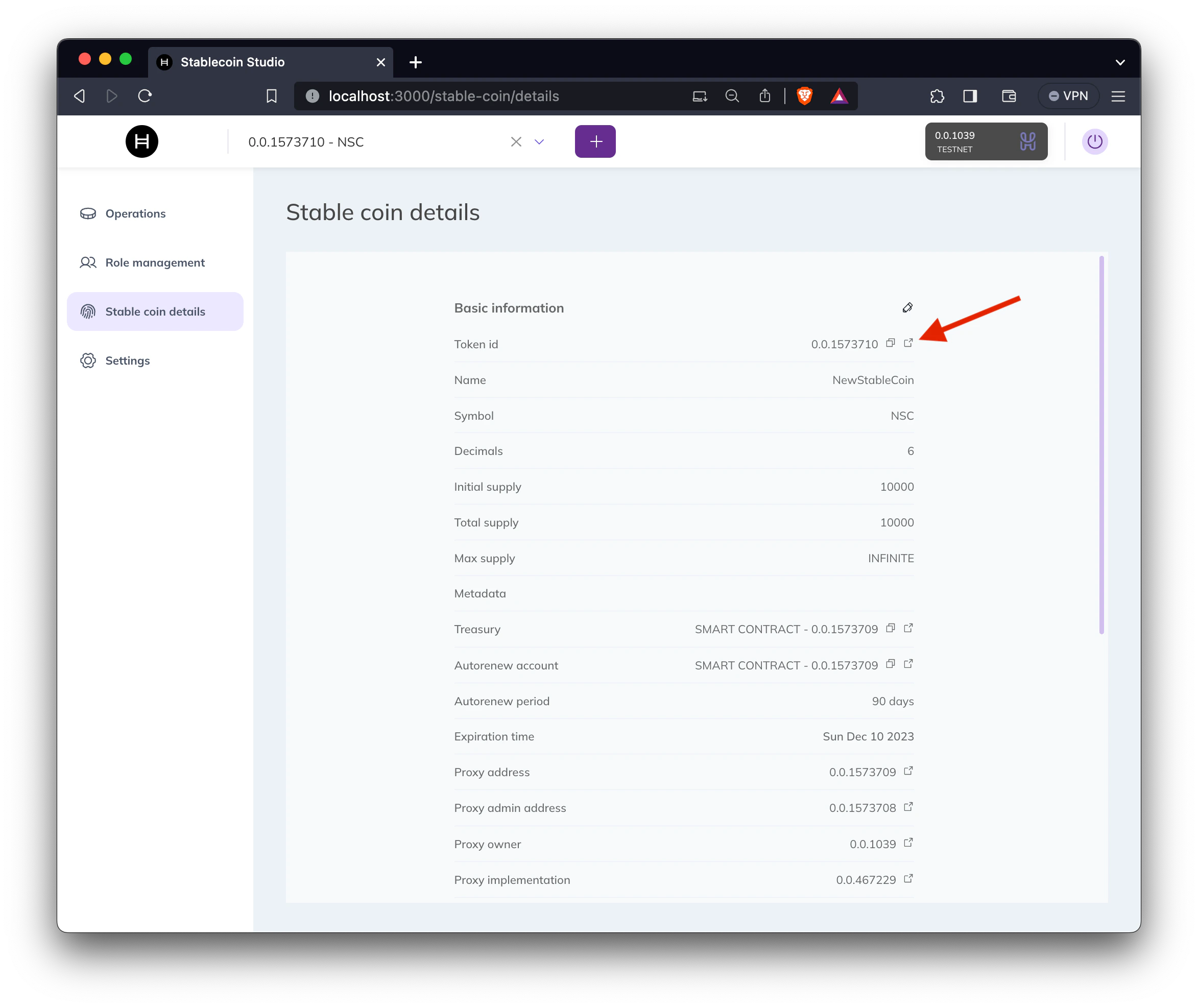 This menu option displays stablecoin details and allows the user to update some token properties, like the name, symbol, and keys. Clicking on the pencil icon located at the top right side of the screen turns the information page into a form where these properties can be modified by the user. 🎉 Congrats on creating your first stablecoin with Stablecoin Studio! View the transaction details on HashScan by looking up your new token ID or clicking the HashScan Explorer link from the “Token ID” field.