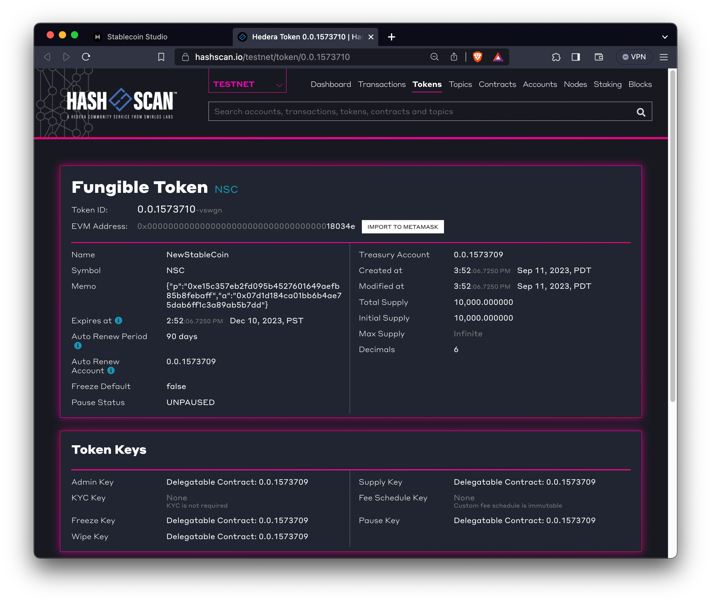 Final validation before creating the stablecoin. Review the stablecoin details and click the “Create stablecoin” button. Validate “Execute Smart Contract” and “Associate Token” transactions in your wallet. Once the stablecoin is created, it will be added to the drop-down list of coins you can access (with the account you used to create the stablecoin).