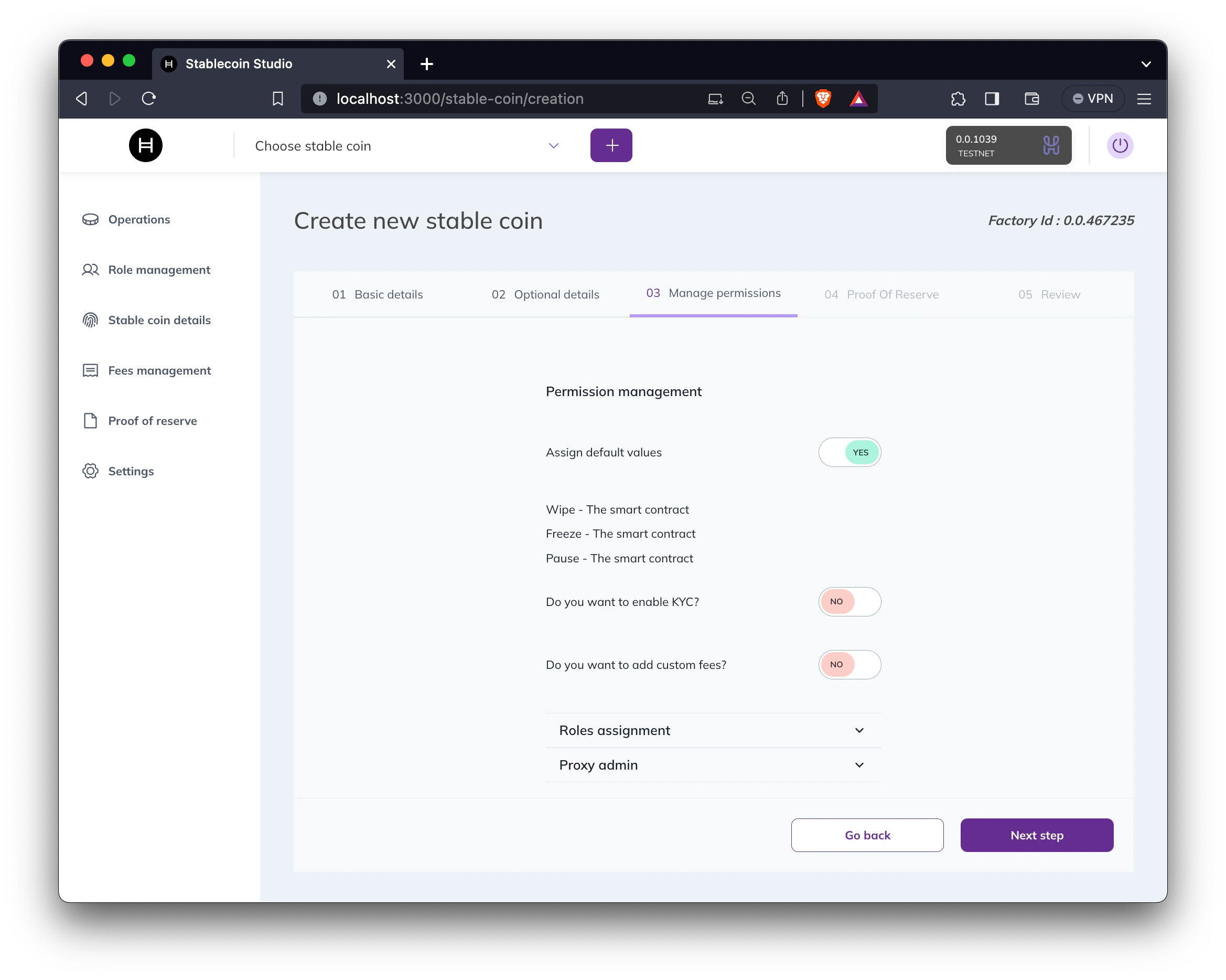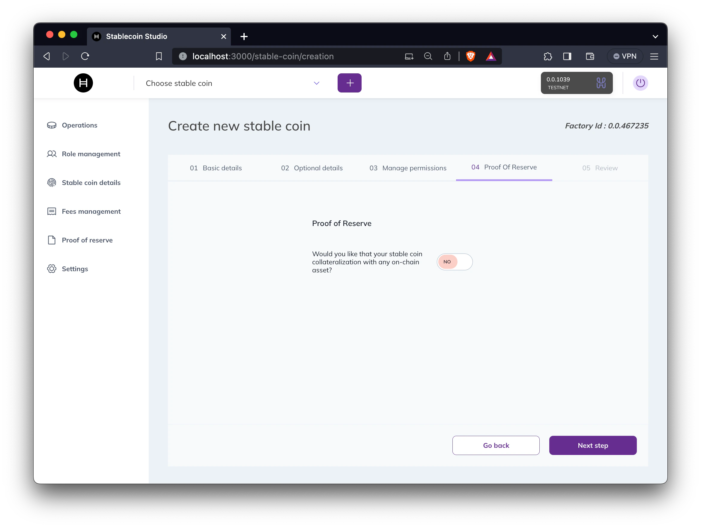 Choose if the stablecoin will be linked to a Proof of Reserve (PoR) contract. You can either use an existing PoR contract address or create a new one using the demo implementation included in the project and setting an initial reserve amount.