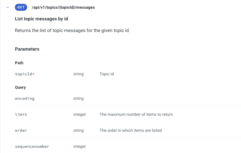 In this section, you’ll learn how to query messages by a sequence number. Each message you submit to a topic receives a sequence number starting from 1. If you take a look at the REST API docs forTopics, you’ll find the first query /api/v1/topics/{topicId}/messages. If you expand this section, you’ll find all query parameters.