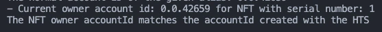 First, create a helper function that creates a TokenNftInfoQuery transaction and returns the account id of the NFT owner for a specific NFT serial number.